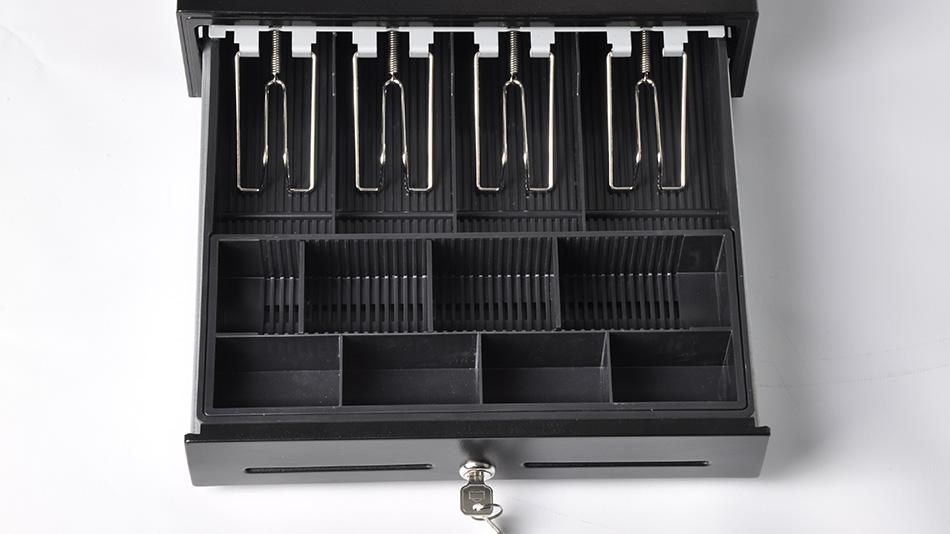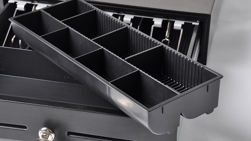 Wyposażona została w 4 przegródki na banknoty oraz 8 przegródek na bilon w wyjmowanym pojemniku.